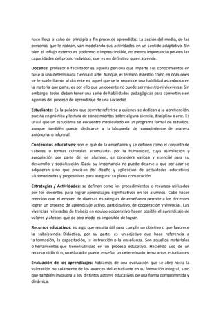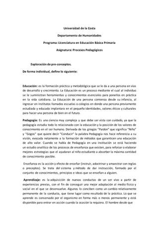 Este documento define varios términos clave relacionados con la educación y la pedagogía. Define la educación, la pedagogía, la enseñanza, el aprendizaje, el docente, el estudiante, los contenidos educativos, las estrategias y actividades, los recursos educativos, la evaluación de los aprendizajes y los procesos pedagógicos. El documento proporciona definiciones concisas de cada uno de estos términos para explorar los preconceptos de los estudiantes en el programa de Licenciatura en