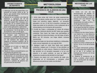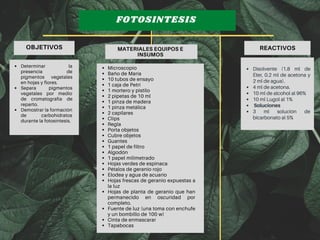 Este documento describe los protocolos para realizar experimentos sobre la fotosíntesis y cromatografía de pigmentos vegetales. Los objetivos son determinar la presencia de pigmentos en hojas y flores usando cromatografía, y demostrar la formación de carbohidratos durante la fotosíntesis mediante la detección de almidón. Se detallan los materiales, reactivos y metodologías requeridas para estos experimentos, incluyendo el uso de hojas de plantas, soluciones químicas, microscopios y otros equipos.