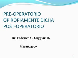 Este documento describe las diferentes etapas del proceso quirúrgico, incluyendo el pre-operatorio, la operación propiamente dicha y el post-operatorio. En el pre-operatorio, se realizan estudios y exámenes para preparar al paciente para la cirugía. La operación incluye la dieresis, la cirugía en sí y la síntesis. En el post-operatorio, el paciente es monitoreado mientras se recupera de la cirugía.
