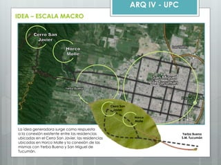El documento presenta tres alternativas de distribución espacial para un proyecto de complejo universitario que conectará diferentes sectores. Se elige la tercera alternativa por integrar mejor los equipamientos existentes y proyectados a través de recorridos peatonales. Se incluyen planos de zonificación de cada sector del complejo con detalles sobre usos y accesos.