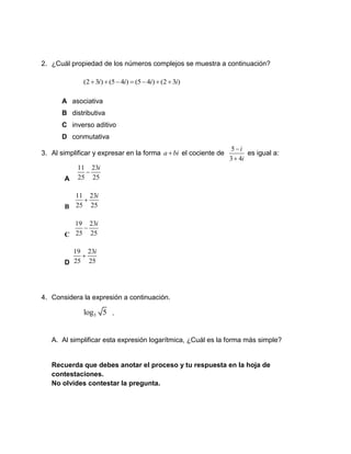 Este documento presenta una prueba de matemáticas de pre y postest para los cursos de Álgebra II y Álgebra II Avanzado. La prueba contiene 30 preguntas que cubren estándares como numeración y operaciones, álgebra, funciones, geometría, análisis de datos y probabilidad. Las instrucciones indican que los estudiantes deben seleccionar la respuesta correcta en una hoja de respuestas separada sin escribir en el documento de la prueba.