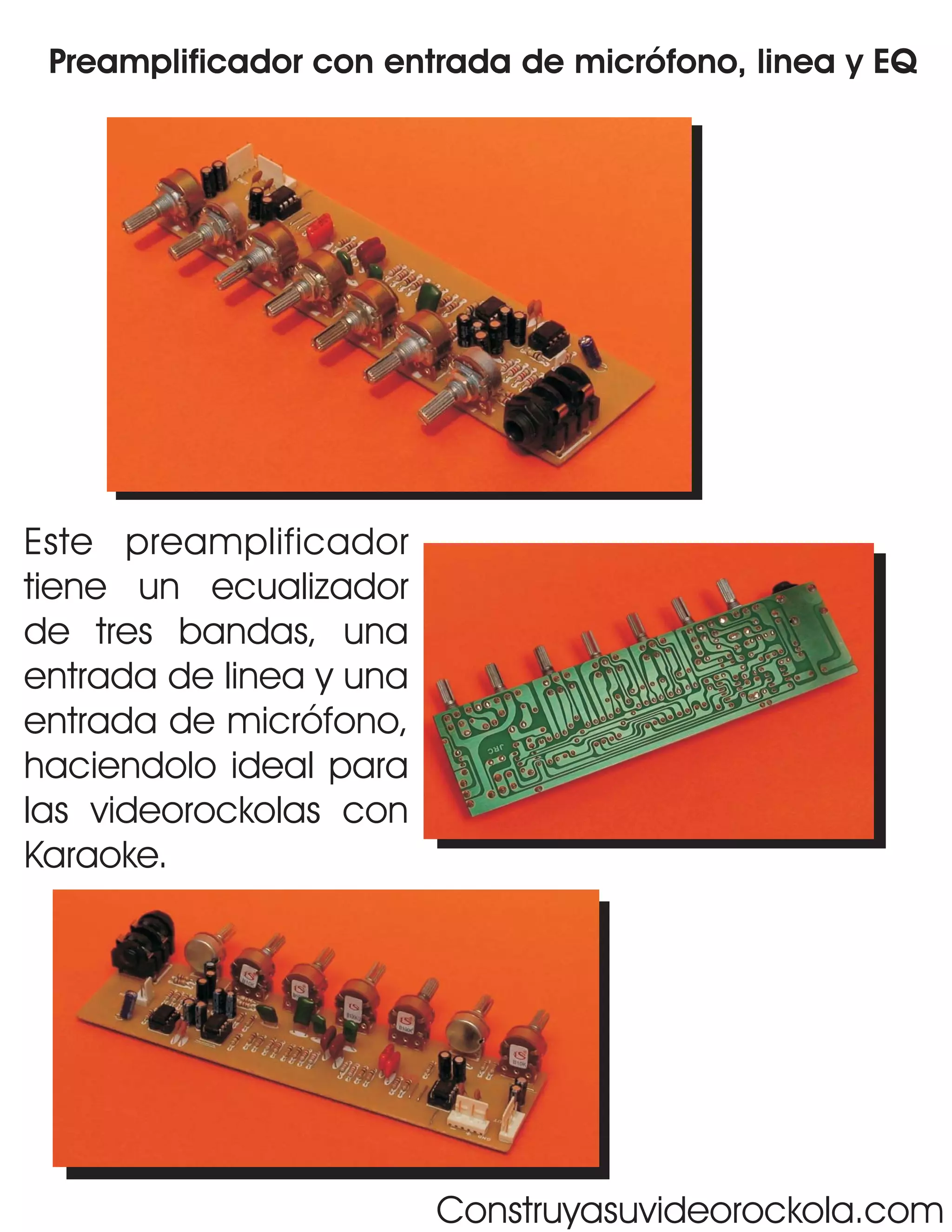 Este preamplificador tiene tres entradas (micrófono, línea y EQ) y un ecualizador de tres bandas, lo que lo hace ideal para karaoke. Incluye instrucciones de construcción, lista de componentes y planos para la placa de circuito impreso.