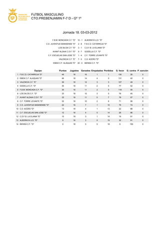 Este documento presenta los resultados de la jornada 18 del campeonato prebenjamín F-7 D. Los equipos F.B.C.D. Catarroja "D", EMDA C.F. Alaquas "D" y Valencia C.F. "E" ocupan los tres primeros puestos en la tabla de posiciones. EMDA C.F. Alaquas "D" tuvo la mayor goleada de la jornada al vencer 20-0 a BienSA C.F. "D".