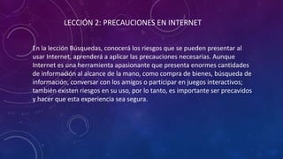 Este documento ofrece consejos sobre cómo navegar de forma segura por Internet. Recomienda no compartir información personal con desconocidos, mantener los sistemas actualizados y usar protecciones de seguridad. También advierte sobre amenazas como el robo de contraseñas, spam, malware y virus, y ofrece consejos para evitar el correo basura y los virus. Finalmente, destaca la importancia de enseñar a los menores a no reunirse con desconocidos, compartir fotos personales o información privada en línea.