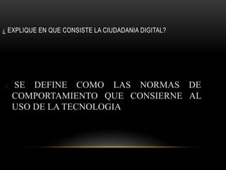 La ciudadanía digital se refiere a las normas de comportamiento para el uso de la tecnología e incluye formas como el e-learning, b-learning y m-learning. La sociedad de la información se caracteriza por la creación, distribución y manipulación de información como parte importante de las actividades culturales y económicas, y los métodos de generación de riqueza pasan del sector industrial al de servicios. Las TIC permiten transmitir, procesar y difundir información de manera instantánea y son la base para reducir la brecha digital.