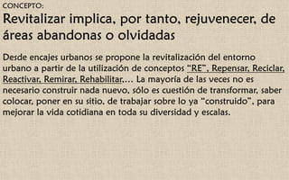 Este documento presenta una propuesta de revitalización urbana para mejorar la 2da calle entre la 4ta y 10ma avenida en la Zona 3 de Cobán, Guatemala. Actualmente la calle se encuentra en abandono y descuido. La propuesta incluye restringir el tráfico vehicular, agregar bolardos, mejorar la iluminación, agregar bancas y basureros, y plantar árboles. También se propone construir un edificio de uso mixto con comercio en la planta baja, oficinas en el segundo nivel