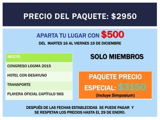 Este documento detalla los precios oficiales para el Congreso Nacional IIE 2015 que se llevará a cabo en San Luis Potosí. Incluye paquetes para miembros y estudiantes en general con hotel y desayuno, transporte, playera oficial desde $2950 hasta el 19 de diciembre y desde $3100 del 20 de diciembre al 29 de enero, con pagos en varias fechas hasta el 26 de febrero.