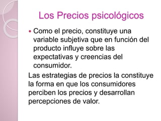 El documento describe diferentes tipos de precios psicológicos que influyen en la percepción de los consumidores, incluyendo precios habituales, precios impares, precios de referencia internos y externos, y precios máximos y mínimos. También explica estrategias como ofrecer precios conjuntos o mostrar descuentos para mejorar la percepción de valor. En general, destaca que los precios afectan las expectativas y creencias de los consumidores más allá del costo real, y que pequeños cambios en la presentación del precio pueden influir