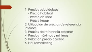 El documento describe diferentes tipos de precios psicológicos como precios habituales, en línea e impares, y cómo afectan la percepción del cliente. También discute el uso de precios de referencia internos y externos, y cómo establecer un rango de precios máximos y mínimos. Finalmente, explica cómo el neuromarketing analiza cómo el cerebro humano se ve afectado por emociones y placer al tomar decisiones de compra.