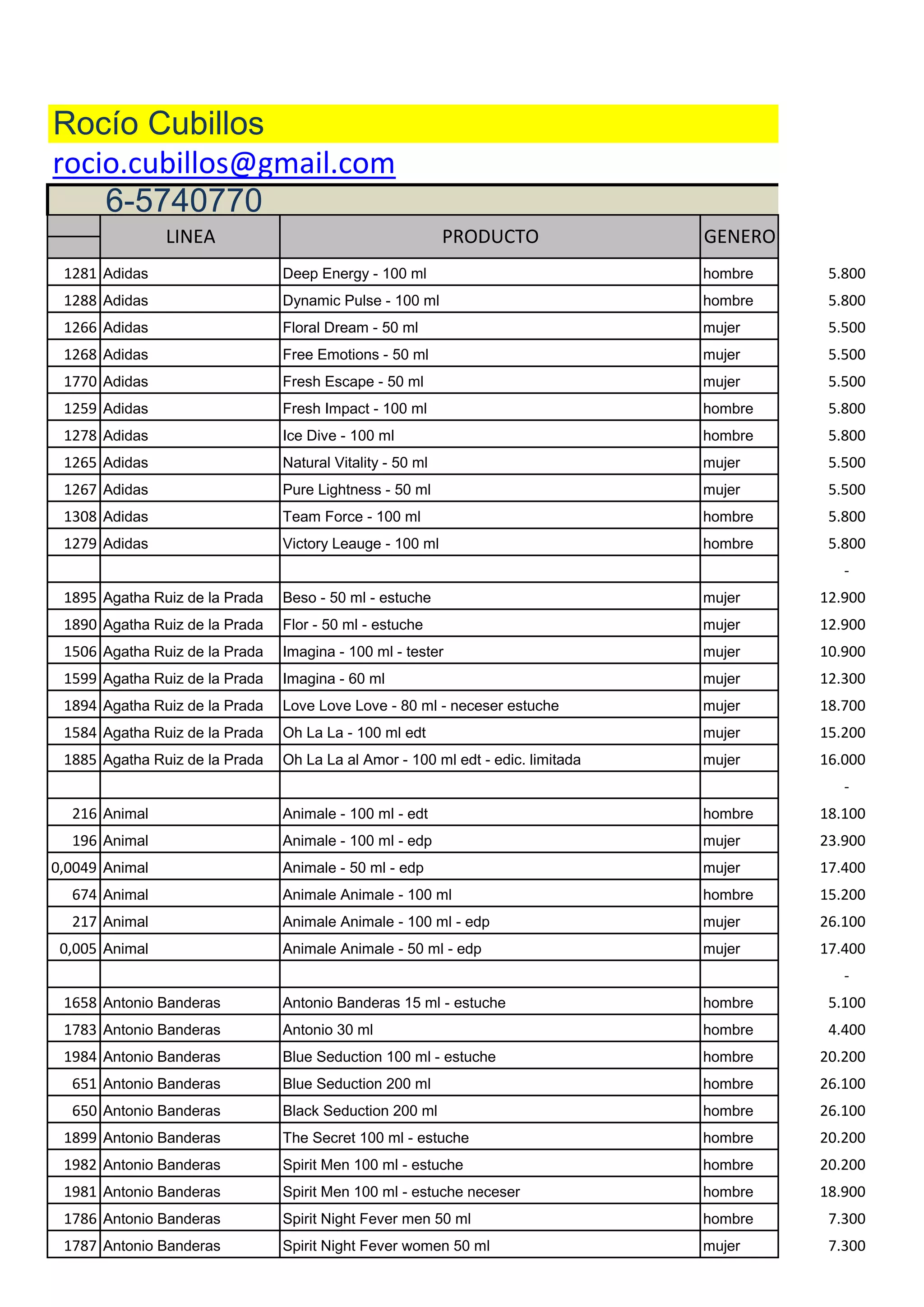 Este documento presenta una lista de productos de fragancias, incluyendo la línea, producto, género y precio. Se enumeran más de 100 artículos de marcas como Adidas, Agatha Ruiz de la Prada, Animal, Antonio Banderas, Armani, Azzaro, Benetton y Beverly Hills. La lista proporciona detalles sobre fragancias como Acqua di Gio, Code, Animale y Chrome en formatos como edt, edp y estuches de regalo.