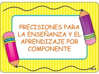 Este documento presenta las precisiones para la enseñanza y el aprendizaje por componente de primer año de educación general básica. Explica los objetivos y estrategias para desarrollar las cinco macrodestrezas: comprensión y expresión oral y escrita, comprensión y expresión artística, y expresión corporal. Describe actividades para fomentar habilidades como escuchar, hablar, leer, escribir, música, artes plásticas, y movimiento corporal.