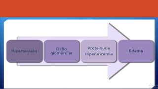 Este documento resume diferentes alteraciones hipertensivas que pueden presentarse durante el embarazo, incluyendo preeclampsia, eclampsia y síndrome HELLP. Define estas condiciones y discute su etiología, factores de riesgo, diagnóstico, vigilancia, tratamiento y metas terapéuticas. Se recomienda la medición de la presión arterial y proteinuria para el diagnóstico y monitoreo. El tratamiento puede incluir medicamentos antihipertensivos y nacimiento del feto para resolver la condición.