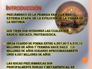 El documento resume la era Precámbrica, la primera y más extensa etapa de la evolución de la Tierra. Se divide en los períodos Hádico, Arcaico y Proterozoico. Durante este tiempo se formaron la litosfera, hidrosfera y atmósfera primitivas. La primera corteza continental data de entre 3.800 y 2.800 millones de años. Se encontraron los fósiles más antiguos de bacterias de hace 3.460 millones de años. El clima varió entre períodos cálidos y fríos e incluso hubo algunas gl