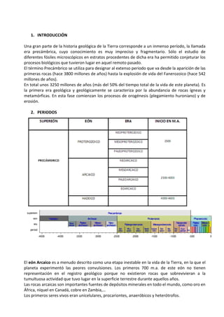 El documento proporciona información sobre el Precámbrico, el período geológico más largo que abarca desde la aparición de las primeras rocas hace 3800 millones de años hasta hace 542 millones de años. Durante este período, la Tierra experimentó gran actividad volcánica y tectónica, y la vida evolucionó de bacterias unicelulares a organismos pluricelulares. El clima varió entre períodos cálidos y fríos extremos que incluyeron varias glaciaciones globales. Los fósiles del Prec