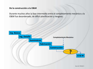 Este documento describe las tres etapas clave en la puesta en marcha de plantas industriales: 1) Pre-comisionado, 2) Comisionado y 3) Puesta en marcha. La etapa de Pre-comisionado involucra verificaciones estáticas sin energía para asegurar la construcción correcta. La etapa de Comisionado consiste en pruebas dinámicas con energía. Finalmente, la Puesta en marcha incluye el arranque inicial, ajuste de parámetros y una corrida de aceptación para verificar el diseño. Dividir el proceso