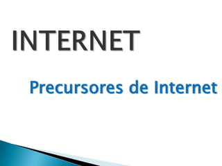 Este documento presenta una breve historia de los precursores de Internet como Vannevar Bush y su idea de Memex, y J.C.R. Licklider y su trabajo pionero en computación interactiva. También describe los primeros pasos de Internet a través de redes como ARPANET y el desarrollo de protocolos como TCP/IP. Finalmente, incluye una cronología de hitos importantes en la evolución de Internet desde la década de 1970 hasta principios de los 2000.