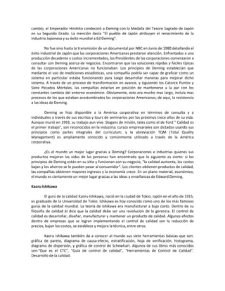 El documento describe las contribuciones de Edward Deming y Kaoru Ishikawa al desarrollo de la calidad total. Deming enseñó métodos estadísticos de control de calidad a los japoneses después de la Segunda Guerra Mundial que ayudaron a revitalizar la industria japonesa. Ishikawa promovió las siete herramientas básicas de control de calidad y los círculos de calidad en Japón. Ambos ayudaron a establecer los estándares modernos de calidad total.
