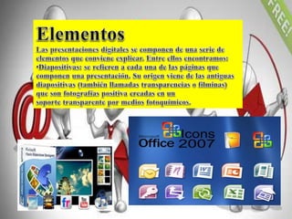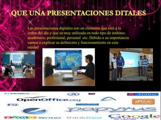 Este documento habla sobre las presentaciones digitales. Explica que las presentaciones digitales son archivos multimedia que usan diapositivas con texto, gráficos, fotos, música y video para ayudar a presentar un tema a un grupo de personas. Las presentaciones son útiles porque limitan el uso de notas, proveen una estructura fácil de seguir, facilitan recordar la información, y permiten actualizar y ampliar el contenido fácilmente. Luego, discute la importancia de los títulos y el fondo en las diapositivas, dando consejos