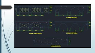 El documento describe el proceso de predimensionamiento de estructuras. Explica que el predimensionamiento involucra determinar el tamaño preliminar de los elementos estructurales al inicio de un proyecto y cómo esto afecta el diseño arquitectónico y la viabilidad del proyecto. Luego detalla los pasos para predimensionar losas, vigas, columnas, placas de entrepiso y zapatas, incluyendo consideraciones sobre materiales, cargas y criterios de resistencia y servicio.