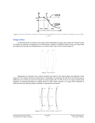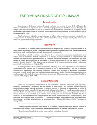El documento describe el predimensionado de columnas de diferentes materiales como madera, acero y concreto armado. Explica que la columna es un elemento estructural vertical que soporta la carga de una edificación y que su diseño depende de factores como la esbeltez, excentricidad de cargas y carga crítica. También presenta ecuaciones y métodos para calcular la resistencia de columnas según su material y dimensiones.