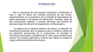 Este documento presenta el predimensionado de los elementos estructurales para una vivienda unifamiliar de dos niveles. Calcula las dimensiones de las columnas esquineras, de borde y centrales, las cuales serán de secciones uniformes de 20x20cm, 25x25cm y 30x30cm, respectivamente. También determina las dimensiones de las vigas del entrepiso, las cuales serán uniformadas en 30x60cm para proporcionar apoyo parejo a la losa nervada de 30cm de espesor.
