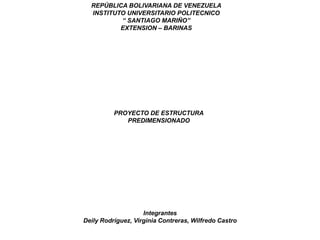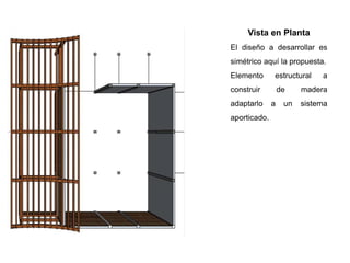 El documento presenta el predimensionado de una estructura de madera simétrica con vista en planta y lateral. Incluye una isometría del predimensionado y detalles de la losa de techo, losa de entrepiso y columnas, donde se utilizará laminas calibre 14 perforadas y unidas a la madera.