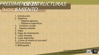 Este documento presenta información sobre el predimensionamiento de diferentes elementos estructurales como cimientos, zapatas, vigas, losas y concreto. Explica conceptos como cimientos corridos, zapatas aisladas, dimensionamiento de vigas y losas. También describe factores a considerar en el diseño de mezclas de concreto como trabajabilidad, resistencia, tamaño máximo de agregado y ajustes por humedad. El objetivo es brindar herramientas para el análisis y diseño preliminar de estructuras.