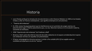 Este documento resume la historia, definición, epidemiología, factores de riesgo, fisiopatología, diagnóstico y tratamiento de la preeclampsia. La preeclampsia es una complicación del embarazo caracterizada por hipertensión y daño a múltiples órganos después de las 20 semanas de gestación. Su causa exacta es desconocida pero involucra una placentación anormal y factores angiogénicos. El diagnóstico se basa en la presión arterial elevada y proteinuria o daño a órganos