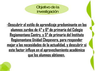 Este documento resume una investigación educativa sobre los estilos de aprendizaje de estudiantes zurdos en escuelas primarias de Monterrey, México. La investigación buscaba descubrir el estilo de aprendizaje predominante para responder mejor a las necesidades de los estudiantes zurdos y determinar si esto afecta su rendimiento académico. Se utilizó un cuestionario para identificar las personalidades de los estudiantes y observaciones de su desempeño. Las conclusiones fueron que los estudiantes zurdos tendieron más a los estilos visuales y secu
