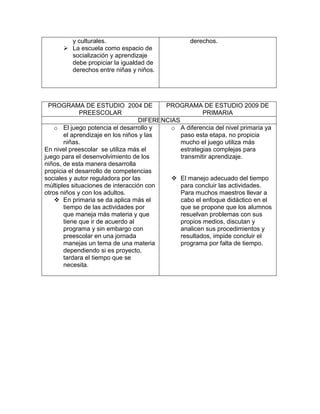 Este documento compara los programas de estudio de preescolar de 2004 y primaria de 2009. Ambos programas comparten semejanzas como fomentar el deseo de aprender en los estudiantes y proveer oportunidades de aprendizaje significativo. Se diferencian en que el programa de preescolar utiliza más el juego para el desarrollo, mientras que el de primaria aplica estrategias más complejas y enfoca más en cumplir con el programa de estudios. Ambos promueven el desarrollo de competencias a través de diversas