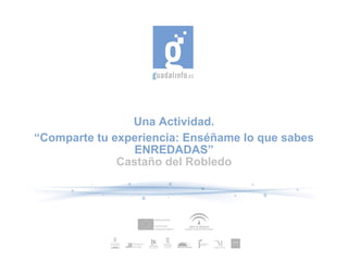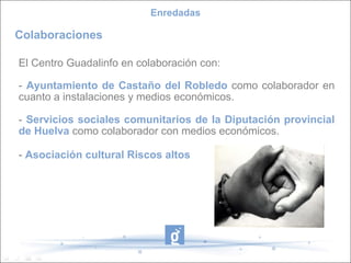 Este documento describe una actividad llamada "Enredadas" organizada por el Centro Guadalinfo de Castaño del Robledo en colaboración con otras organizaciones. El objetivo de la actividad es acercar a las mujeres mayores a las nuevas tecnologías mientras comparten y documentan recetas tradicionales. La actividad ha tenido éxito en integrar a las mujeres y promover el intercambio intergeneracional de conocimientos. Se ha ampliado la colaboración a otros municipios y el blog de recetas se usa ahora para promover la cocina local.