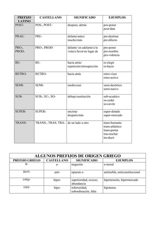 Este documento resume los prefijos latinos y griegos más importantes, incluyendo su significado en castellano y ejemplos de palabras. Explica prefijos como "ab-", "ad-", "ante-", "circum-", "cum-", "contra-", "de-", "dis-", "ex-", "in-", "infra-", "inter-", "intra-", "per-", "post-", "prae-", "pro-", "re-", "retro-", "semi-", "sub-", "super-", "trans-" de origen latino y "é-" y "íp¢r-" de origen griego.