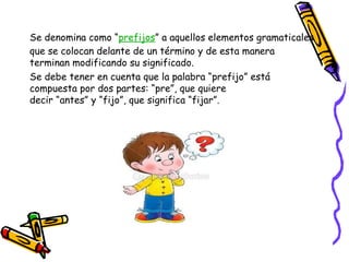 El documento explica diferentes prefijos y su significado. Algunos prefijos indican negación o privación (a-), oposición (anti-), distancia (tele-), reducido tamaño (micro-), repetición (re-), por encima (súper-), por debajo (hipo-), de uno mismo (auto-), o relacionado con el sonido (audi-). Los prefijos se colocan delante de palabras para modificar su significado de alguna manera.