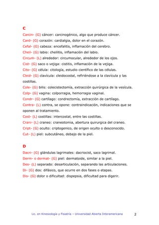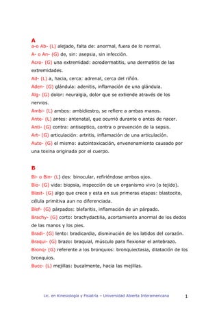Este documento presenta una lista extensa de prefijos y sufijos utilizados comúnmente en términos médicos, con su significado en griego o latín. Los prefijos se refieren a conceptos como parte del cuerpo, cantidad, posición, tiempo y más. Los sufijos describen conceptos como dolor, afección, debilidad y otros. La lista provee una guía concisa pero completa sobre la etimología de muchos términos médicos.