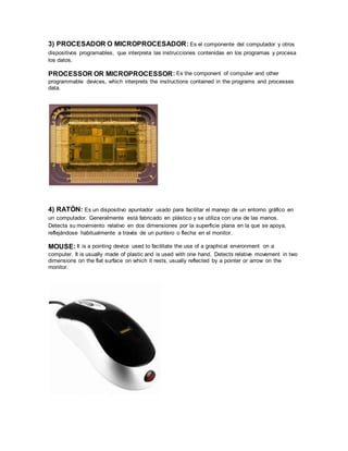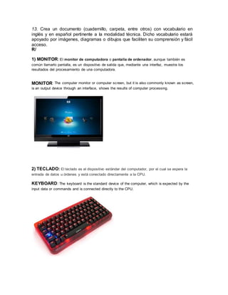 El documento proporciona vocabulario técnico en inglés y español sobre componentes básicos de computadoras y tecnología, incluyendo definiciones de términos como monitor, teclado, procesador, ratón, memoria RAM, regulador de voltaje, resistencia eléctrica, antivirus, virus, pulsera antiestática, desechos tecnológicos y CD-ROM. El vocabulario está acompañado de imágenes y diagramas para facilitar la comprensión.
