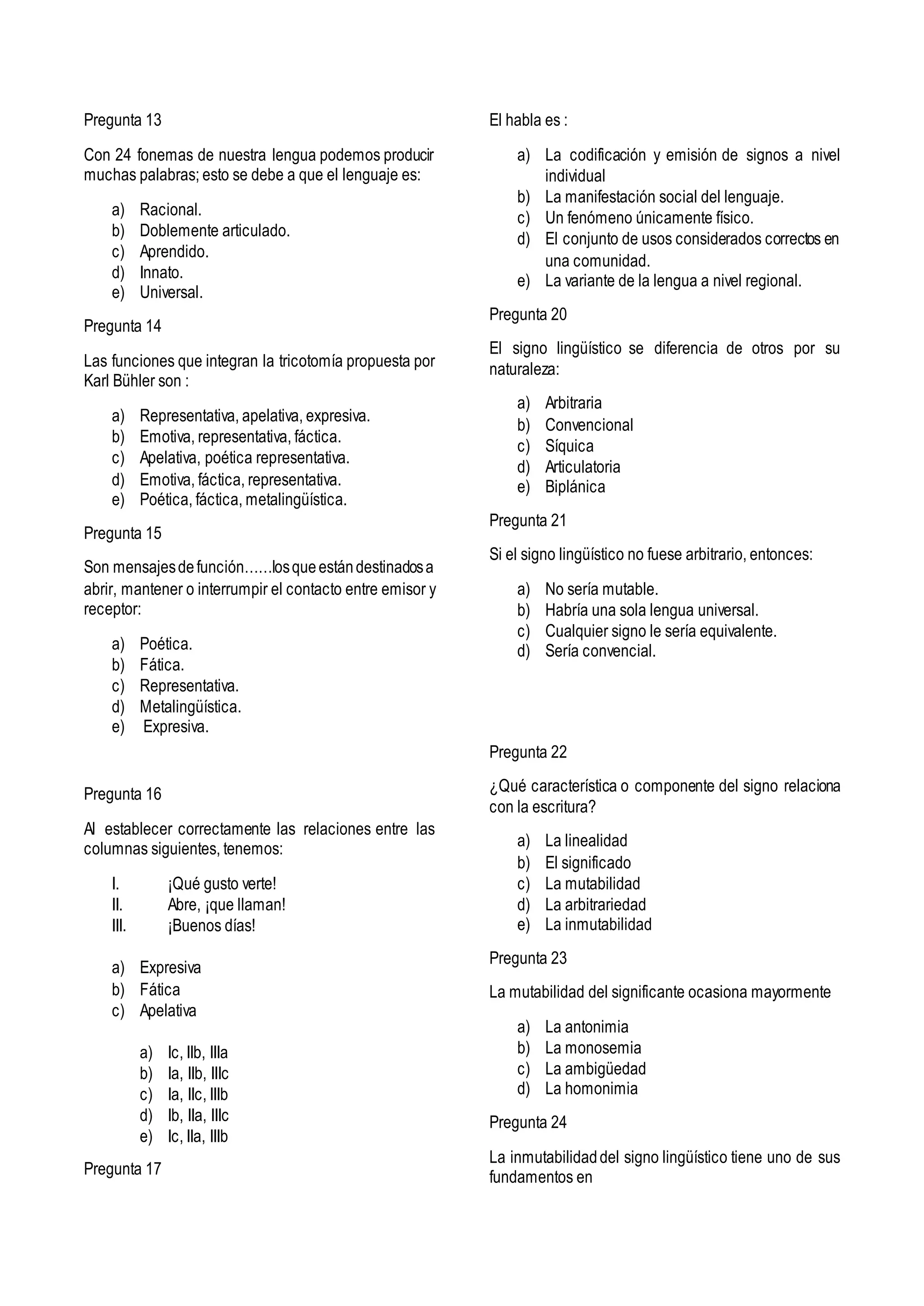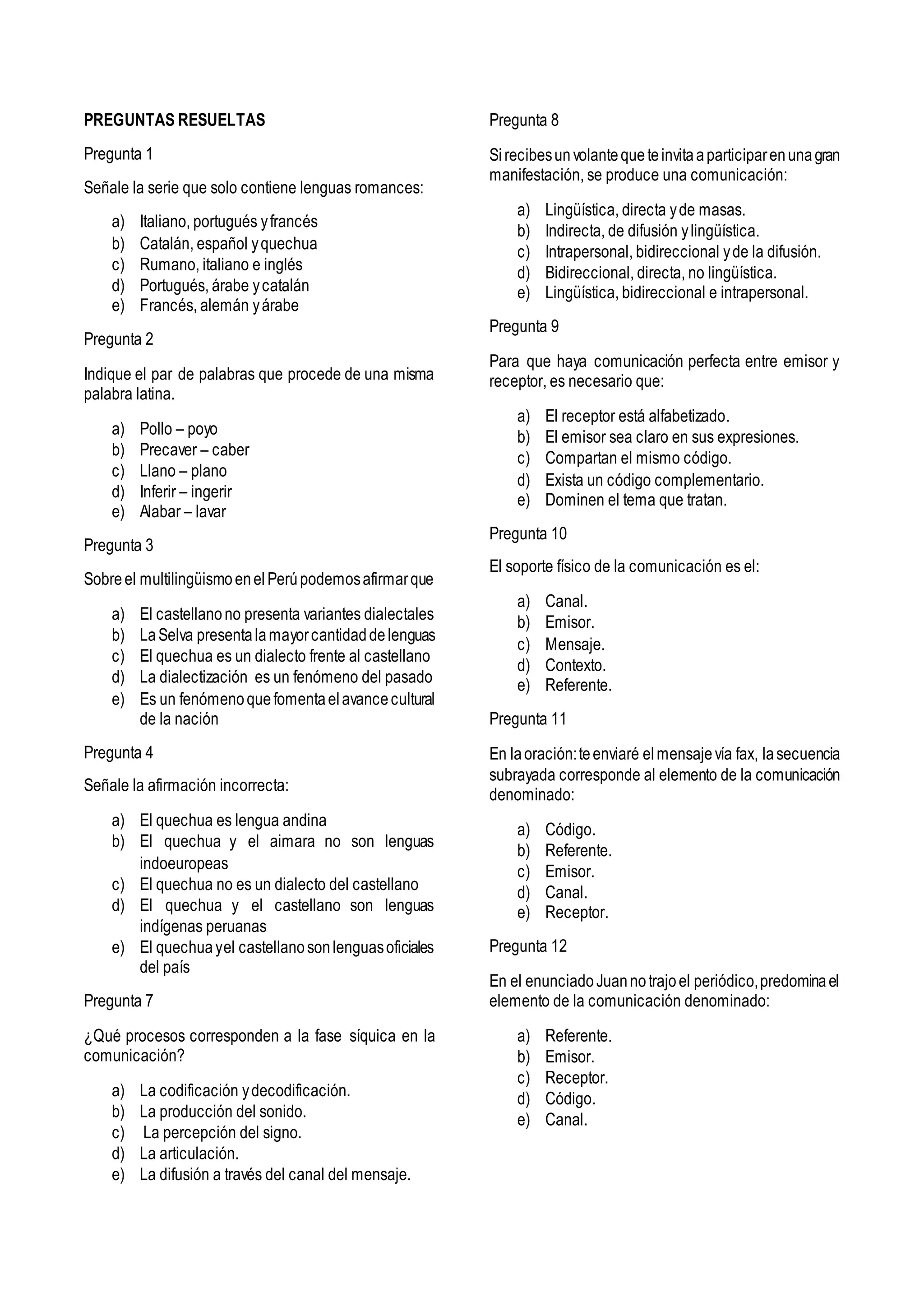 Este documento contiene las respuestas a 30 preguntas sobre diversos temas lingüísticos como lenguas romances, procesos fonéticos en la evolución del castellano, origen de palabras, multilingüismo en el Perú y elementos básicos de la comunicación y la semántica. Las preguntas abarcan desde identificar series de lenguas hasta explicar conceptos lingüísticos específicos. Adicionalmente, se incluyen 20 preguntas propuestas relacionadas principalmente con la evolución del castellano y el contexto ling