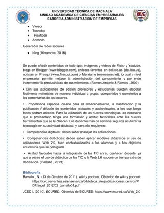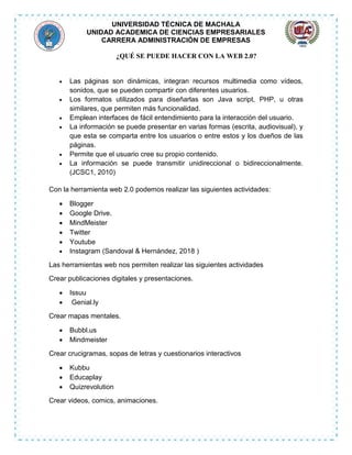 El documento describe las características y funcionalidades de la Web 2.0, incluyendo páginas dinámicas con contenido multimedia compartible, interfaces de fácil uso, y contenido generado por los usuarios. También enumera varias herramientas de la Web 2.0 como Google Drive, Twitter y YouTube que permiten actividades como la publicación de contenido y la creación de mapas mentales, cuestionarios y videos. Finalmente, discute cómo estas herramientas pueden mejorar la administración del conocimiento en empresas y apoyar la enseñanza facilitando la creación