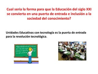 Este documento discute el papel de la tecnología educativa en la sociedad del conocimiento del siglo 21. Argumenta que las unidades educativas con tecnología pueden servir como una puerta de entrada a la revolución tecnológica e inclusión social. También explora cómo la tecnología está transformando los paradigmas sociales y sistemas escolares, y propone algunas hipótesis para un diálogo fructífero entre educación y tecnología que permita a más personas acceder al conocimiento.