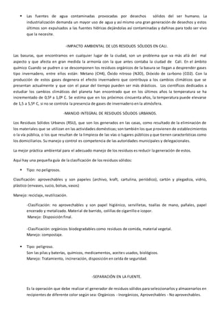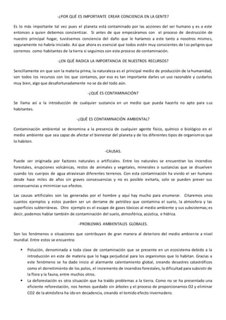 El documento explica la importancia de crear conciencia ambiental debido a que la contaminación generada por los seres humanos está dañando el planeta. También describe los conceptos de contaminación y contaminación ambiental, así como las principales causas de contaminación como los derrames de petróleo y las emisiones de gases tóxicos. Finalmente, resalta algunos de los problemas ambientales globales más graves, como la polución, la deforestación y la contaminación de fuentes de agua.