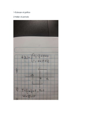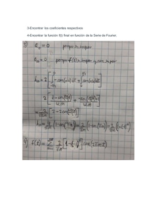 Este documento describe los pasos para encontrar la función f(t) de una serie de Fourier: 1) esbozar el gráfico periódico, 2) hallar el periodo, 3) encontrar los coeficientes respectivos, 4) encontrar la función f(t) final en función de la serie.