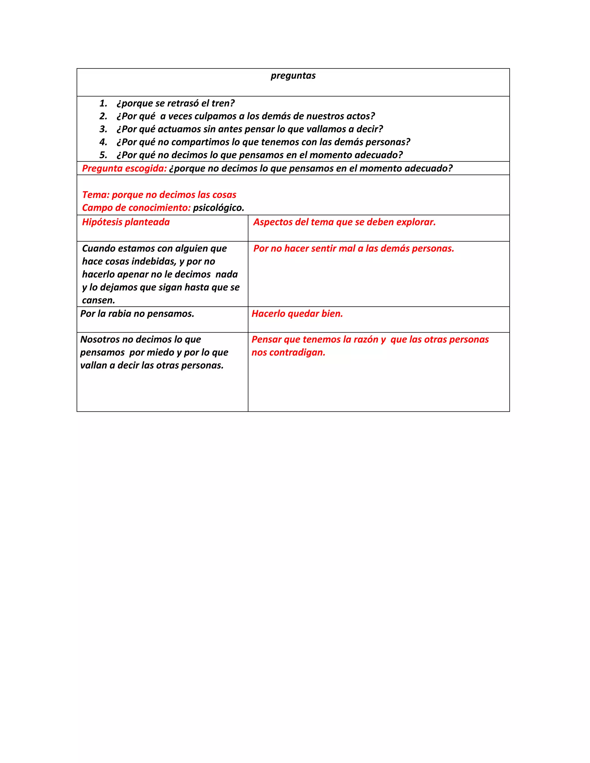 El documento presenta 5 preguntas relacionadas con comportamientos humanos y la selección de la pregunta "¿Por qué no decimos lo que pensamos en el momento adecuado?". A continuación, se plantea una hipótesis sobre por qué las personas no expresan sus pensamientos de inmediato y se enumeran algunos aspectos que deberían explorarse como razones potenciales, incluido no herir los sentimientos de los demás, actuar por enojo sin pensar y el miedo a la contradicción.