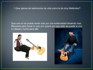 El documento contiene 5 preguntas sobre temas como testimonios de vida inspiradores, las razones por las que algunas personas famosas terminan consumidas por las drogas a pesar del éxito, un proyecto que el autor quisiera desarrollar y sus posibles limitaciones y cómo salvarlas, la definición de una creencia potenciadora, y tres creencias potenciadoras que llaman la atención del autor y cómo se evidencian en situaciones concretas.