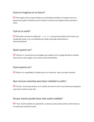 La persona desea ser una pediatra y diseñadora de moda reconocida a nivel nacional e internacional para ayudar a los demás. Su sueño es conocer al creador de Coca-Cola y convertirse en una emprendedora y luchadora que no se rinda. Cree que lo único que necesita para hacer realidad sus sueños es el estudio y fijar metas realistas, y que todas las personas que la apoyen pueden ayudarla.