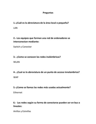Este documento habla sobre las Tecnologías de la Información y la Comunicación (TIC) en la educación. Brevemente explica algunos términos clave relacionados con redes informáticas como LAN, WLAN, WAP, Ethernet, anillos, estrellas, router, RJ45, WAN, tarjeta de red y software. También incluye 10 preguntas breves sobre estos términos.