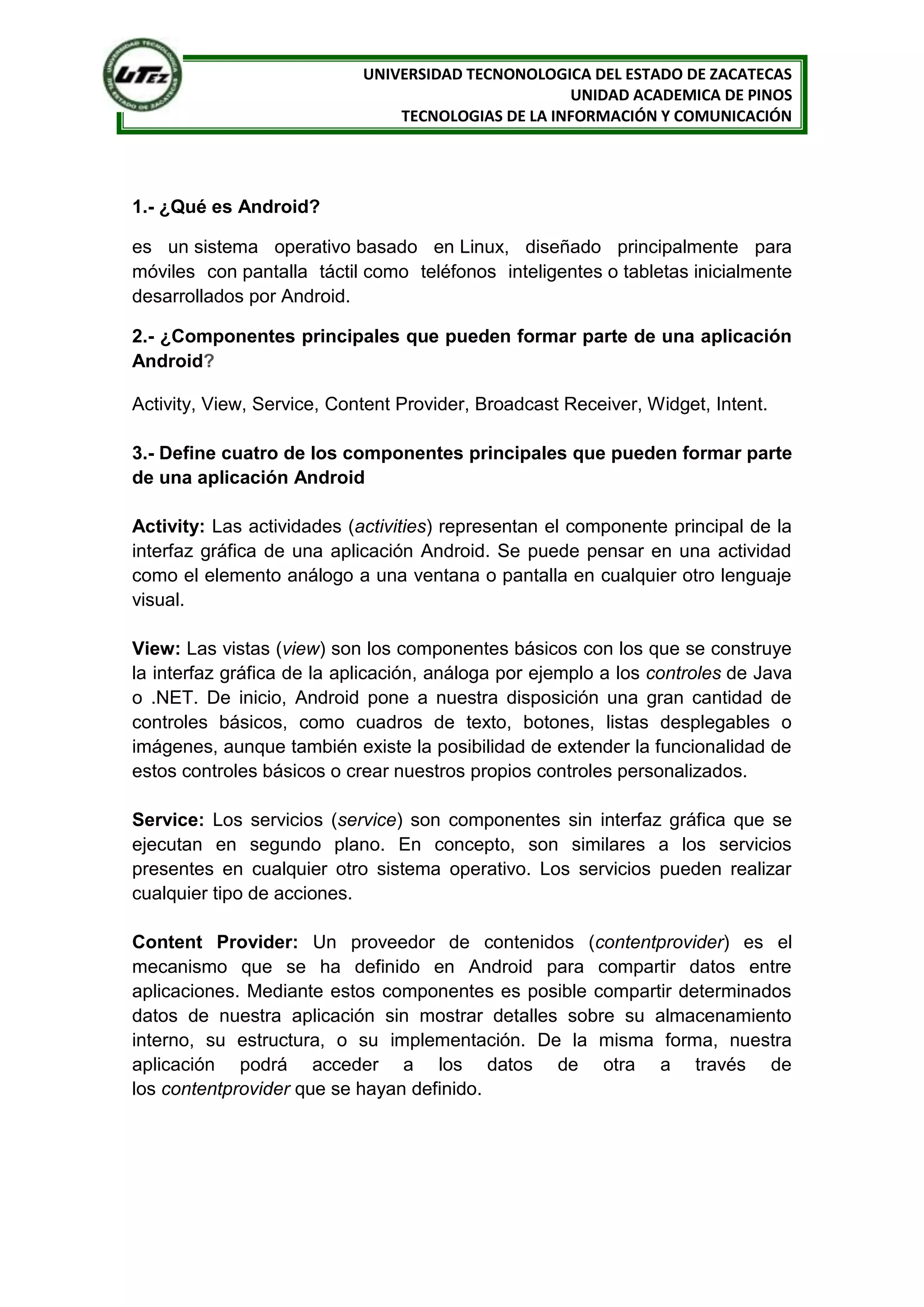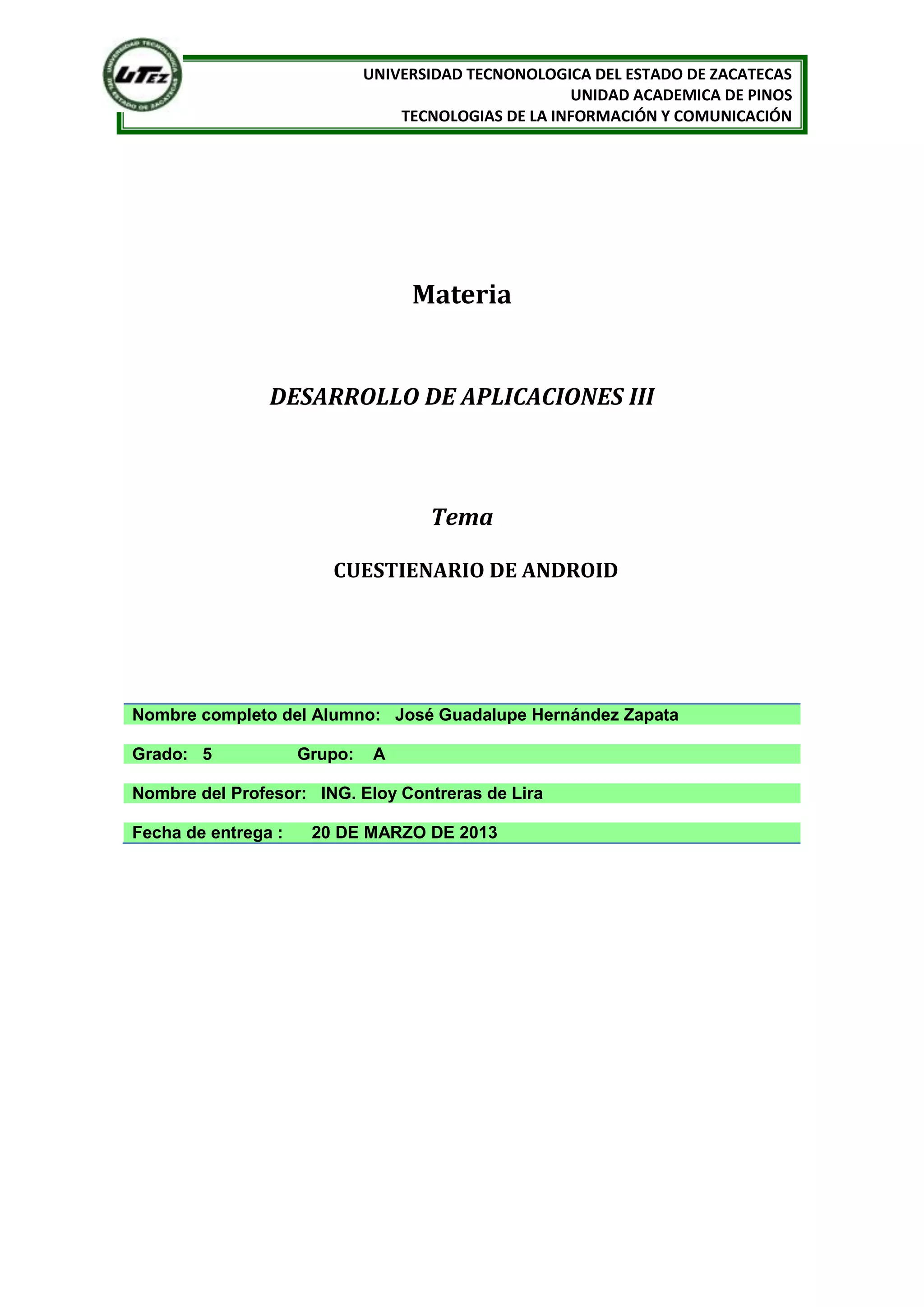 Este documento presenta las respuestas a un cuestionario sobre desarrollo de aplicaciones para Android realizado por el estudiante José Guadalupe Hernández Zapata. El cuestionario cubre temas como los componentes de una aplicación Android, layouts, botones, adaptadores, menús, preferencias y el almacenamiento de datos en SQLite.