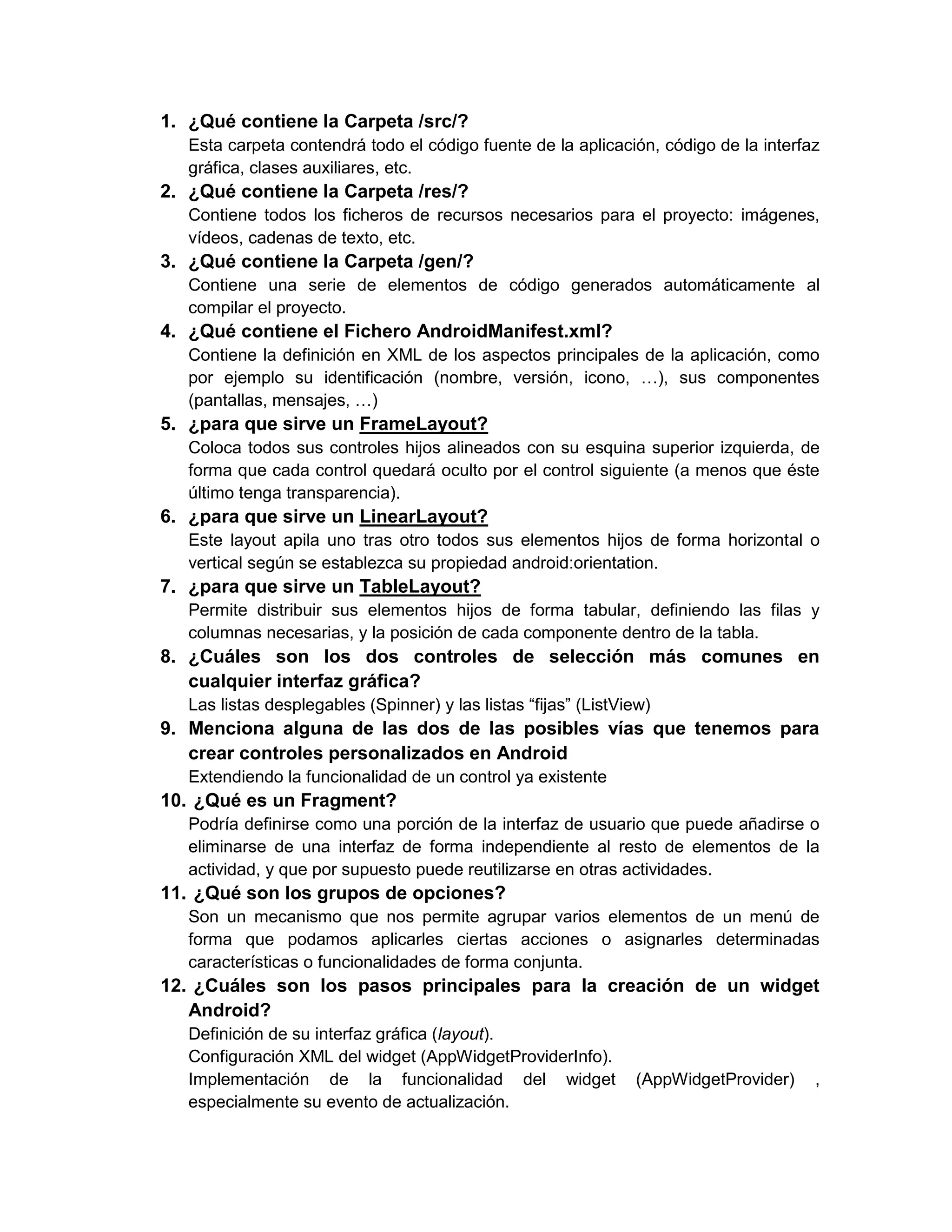 Este documento contiene preguntas y respuestas sobre el desarrollo de aplicaciones móviles en Android. Aborda temas como la estructura de carpetas de un proyecto Android, los tipos de layouts, controles y componentes comunes, el almacenamiento y acceso a datos usando SQLite, y más.