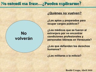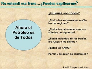 El documento plantea varias preguntas críticas sobre las políticas y la situación actual en Venezuela. En primer lugar, cuestiona a quiénes realmente beneficia la nacionalización del petróleo y la idea de que ahora es "de todos". Luego, interroga quiénes en realidad no volverán al país debido a la falta de oportunidades. Por último, cuestiona conceptos como el "socialismo del siglo XXI", el supuesto "imperialismo" estadounidense, y si la salud y educación son realmente prioridades cuando los hospitales están abandonados y