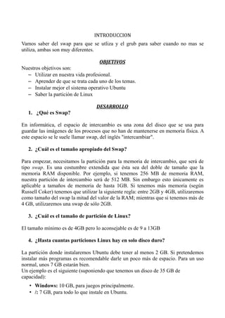 Este documento discute el uso de swap y GRUB en Linux. Explica que swap es un espacio de intercambio que se usa para almacenar procesos no en memoria física, y que su tamaño debería ser del doble de RAM hasta 1GB de RAM, y la mitad de RAM para entre 2-4GB de RAM. También explica que GRUB es un cargador de arranque que permite iniciar múltiples sistemas operativos instalados, y que eliminar particiones Linux desde Windows borraría Linux pero no afectaría a Windows.