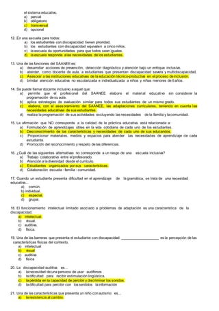 El documento trata sobre la educación inclusiva. Aborda conceptos como reculturización, cultura escolar, comunidades de inclusión, liderazgo transformacional, educación de calidad, derechos de las personas con discapacidad, atención a la diversidad, características de la educación inclusiva y necesidades educativas especiales. Explica el rol del SAANEE y del docente inclusivo, y conceptos relacionados a la discapacidad y su atención en el aula.
