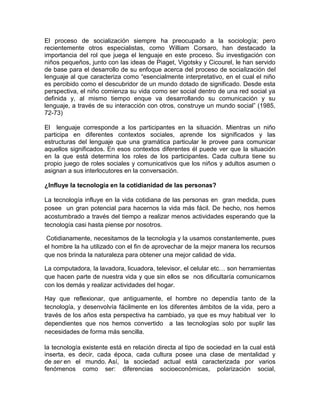 Este documento explora cuatro preguntas: 1) Cómo influyen los medios de comunicación en el desarrollo de los niños. 2) Qué papel juega el lenguaje en el desarrollo social de los niños. 3) Si la tecnología influye en la cotidianidad de las personas. 4) Cómo la tecnología ha complejizado la comunicación. Argumenta que los medios pueden afectar el comportamiento de los niños, el lenguaje les permite interactuar socialmente, la tecnología facilita la vida diaria pero también genera dependencia
